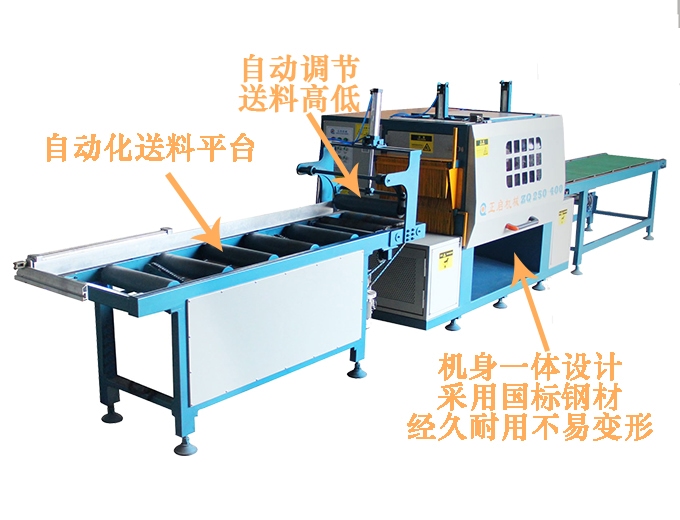 ZQ250全自动方木多片锯具有自动感应调节进料高低尺寸,全自动化辅助送料工作台,工作台具有自动靠边、对中、进料等先进功能,可大幅度减少操作人员的数量,亦可大大减少操作工的劳动强度。上轴采用气缸自动感应压料装置,可实现大小方料随意放,无需调高低,送料平稳速度高,操作和维护保养简单。上下轴的设计,具有锯片直径小,锯路小省料的优点,锯面光滑平整可以代替刨,适用于大方料、长木料的开方开片、实木规格板、建筑模方、实木地板、实木家具等木材加工企业。在国内东北地区、内蒙古满洲里,国外俄罗斯、非洲安哥拉、津巴布韦、刚果、南美巴拿马、中美哥斯达黎加等地区广泛使用。